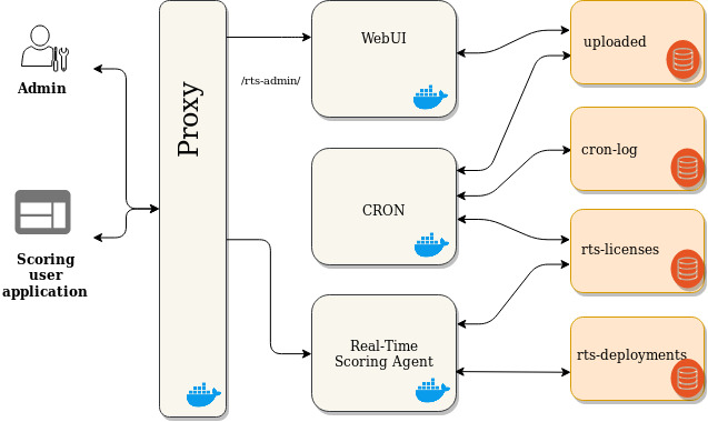 ) for the Real-Time Scoring containers, so they can communicate with each other, but from the external network only the proxy container is available on the 80 and 443 ports. You can use this ports for scoring, and to reach the Web UI (eg. http://localhost, http://localhost/rts-admin/ https://localhost, https://localhost/rts-admin/ or any other IP address or domain name). - The cron container needs the docker socket to be mounted in order to be able to manage (e.g. restart) the other containers. In case this is omitted, you have to restart the proxy container manually after uploading a certificate, and restart the real-time-scoring-agent container after a license is provided or changed.
