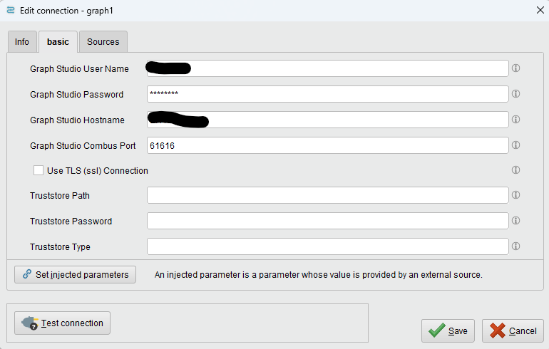 Fill in the connection details, including hostname, port, credentials, and TLS configuration.