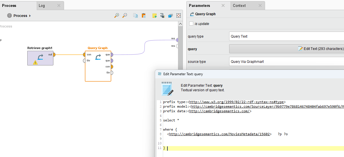 The Query Graph operator allows users to query the graphs in Altair Graph Studio. It's possible to query a datasource, a data set or a graphmart defined in Graph Studio. The SPARQL query can be defined in a text box.